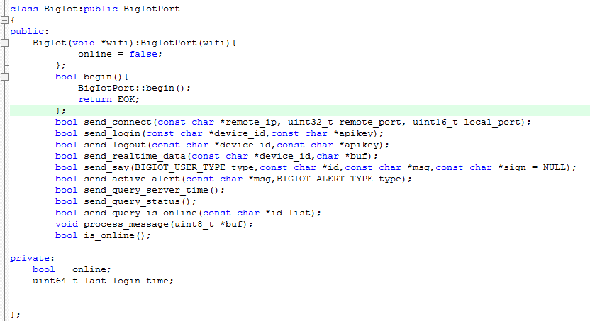 文件bigiot.cpp和bigiot.h 這兩個文件是用戶需要調(diào)用的文件。標準的c++文件。類的結(jié)構(gòu)如下